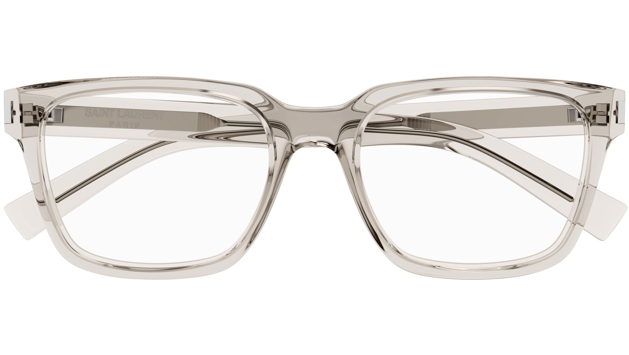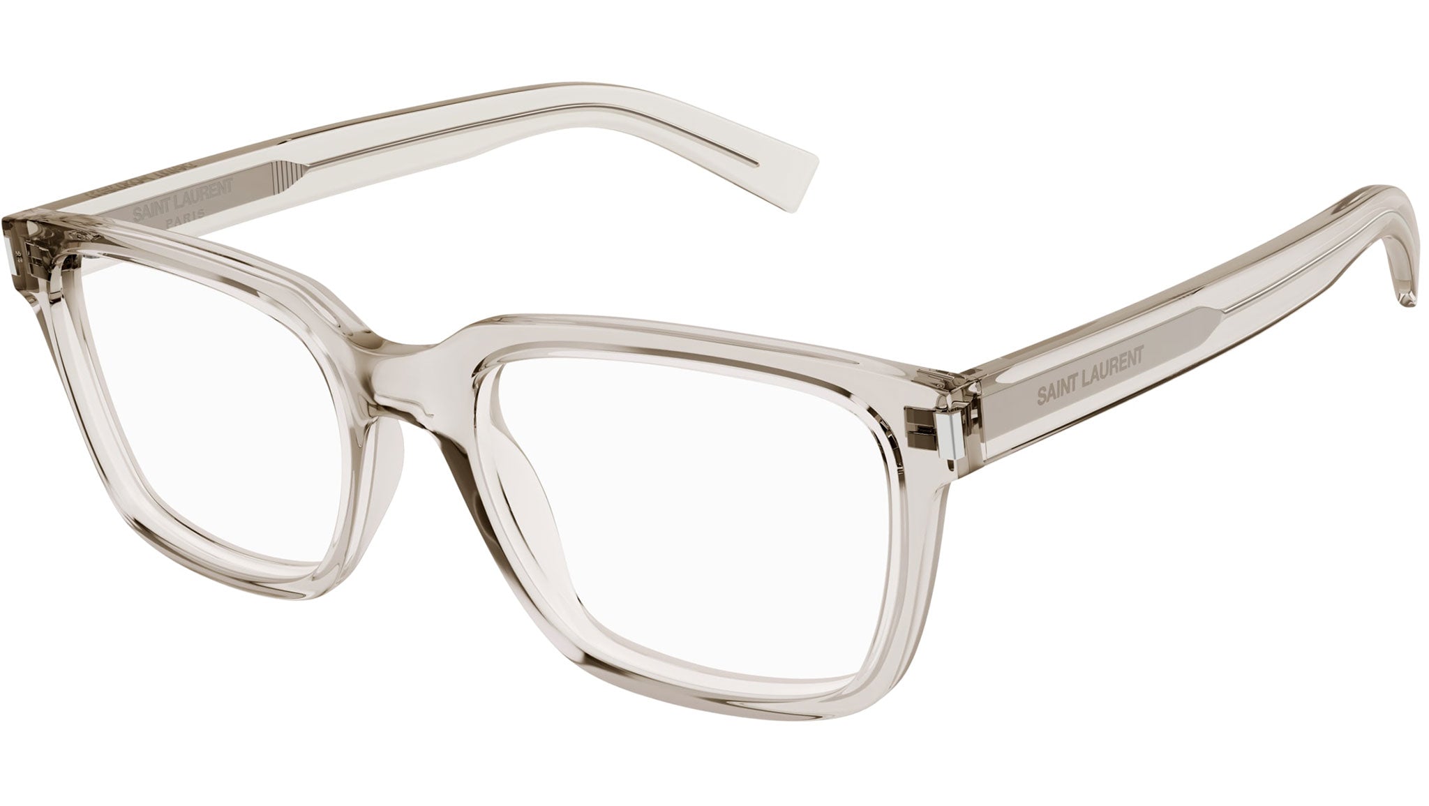Occhiali da vista Saint Laurent modello SL 621 linea Classic codice colore 003 crema trasparente lucido in acetato riciclato forma rectangle con aste color beige.