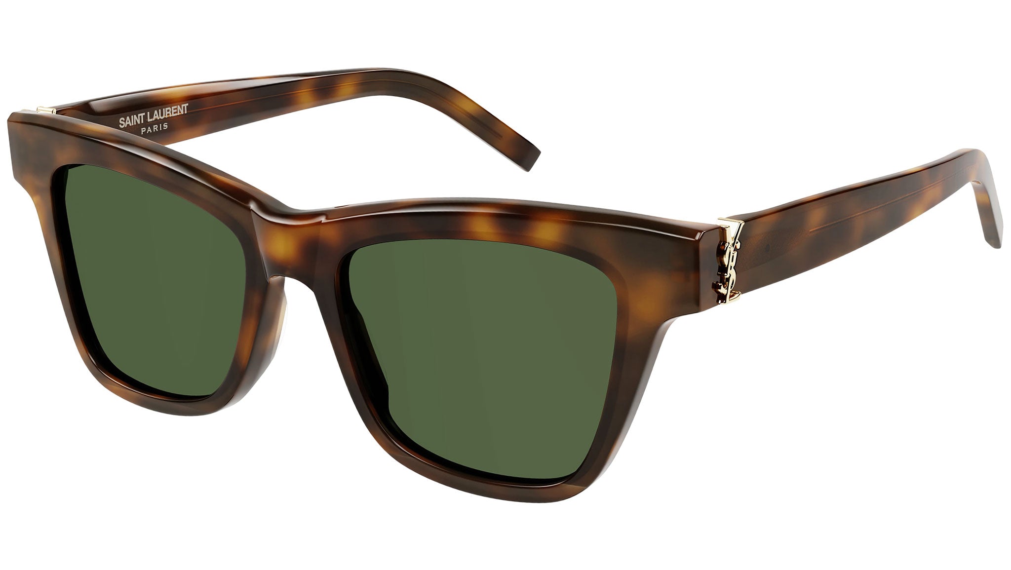Occhiali da sole Saint Laurent linea Monogram modello SL M106 variante colore 003 avana medio lucido con lenti color verde tinta unita.