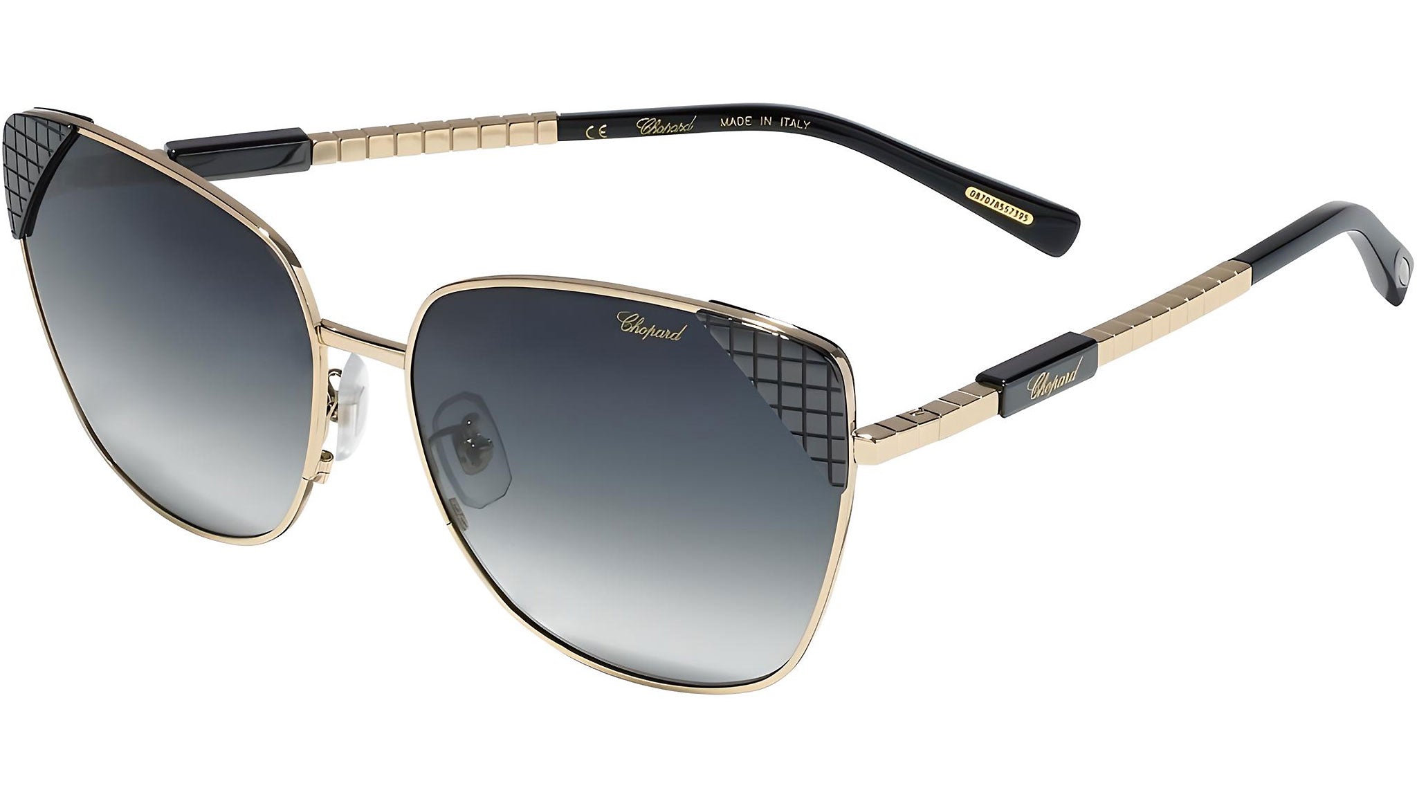 Occhiali da sole Chopard SCHC41 0300 con montatura cat eye da donna in metallo color oro / nero e lenti color grigio. Rivenditore autorizzato Chopard online. Ogni prodotto Chopard viene consegnato con astuccio originale e accessori ed è coperto da garanzia del produttore di 12 mesi.