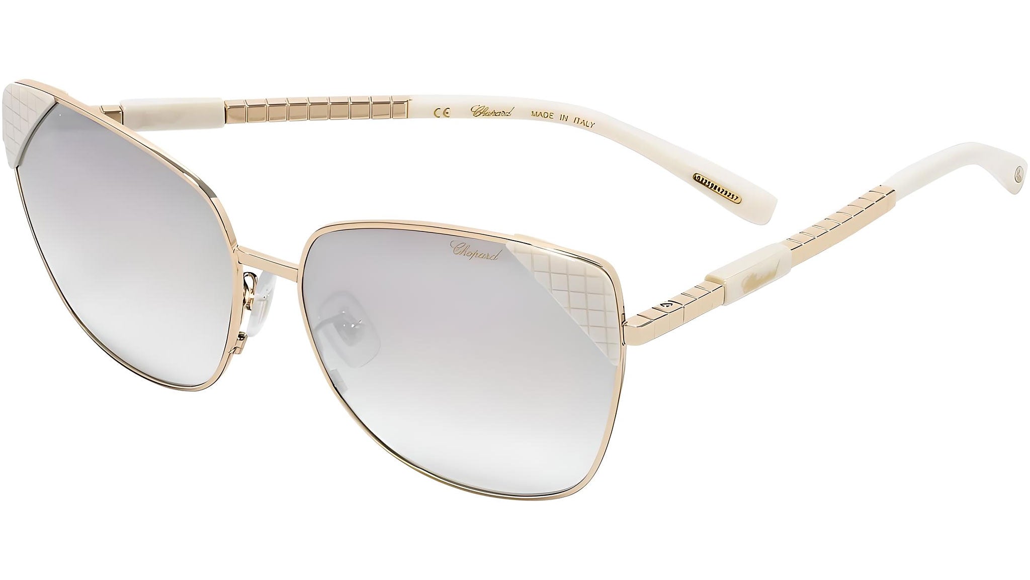 Occhiali da sole Chopard SCHC41 300X con montatura cat eye da donna in metallo color oro rosa e bianco e lenti color violetto sfumato a specchio. Rivenditore autorizzato Chopard online. Ogni prodotto Chopard viene consegnato con astuccio originale e accessori ed è coperto da garanzia del produttore di 12 mesi.
