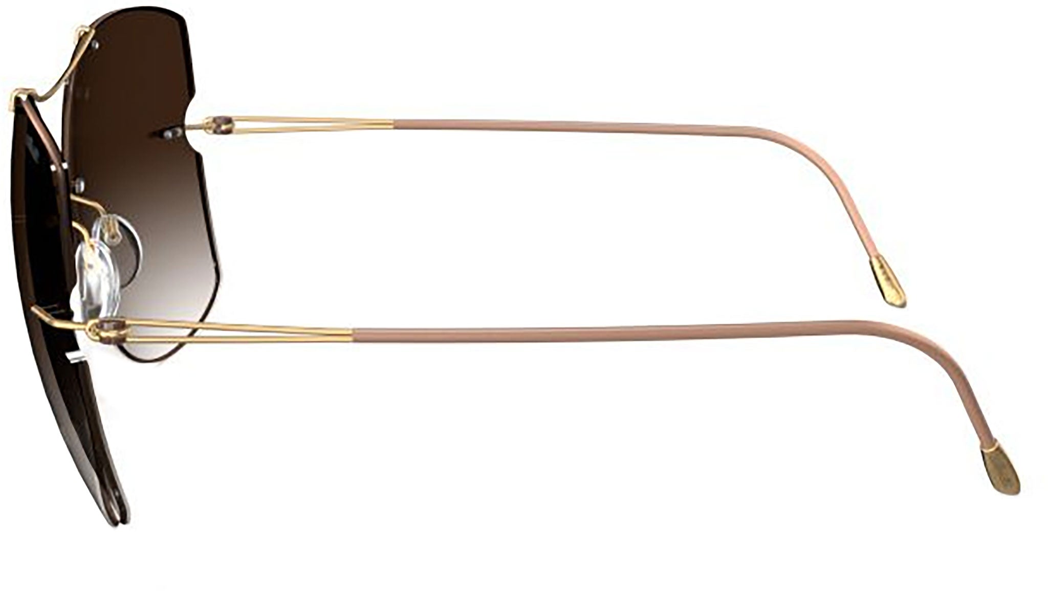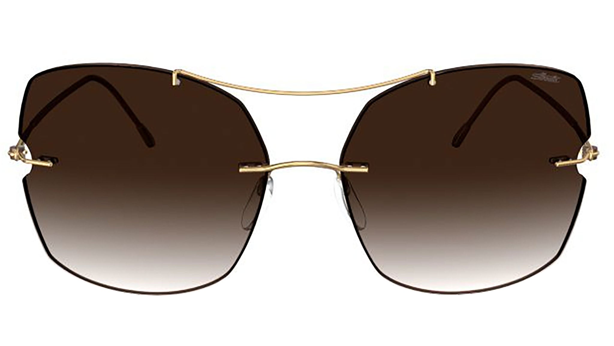 Silhouette Rimless Shades 8183 in 7530 frame color featuring classic brown gradient lenses. The Rimless Shades Collection marries the understated elegance of ultra-thin titanium with the boldness of oversized lenses infused with vibrant color. The collection's sensual curves and cut-outs lend a fluidity between the lenses and temples, adding a touch of luxury and femininity. The Star Island model stands out with its stylish sloping double bridge that injects a unique flair and personality. These lightweight glasses offer exceptional comfort, are hypoallergenic, and constructed without screws, featuring a base 6 curvature. The lenses are coated with an anti-reflective coating on the backside, made from high-impact polycarbonate, and can be customized with prescription lenses upon consultation with your retailer. They provide full UV A, B, and C protection, equivalent to UV 400.