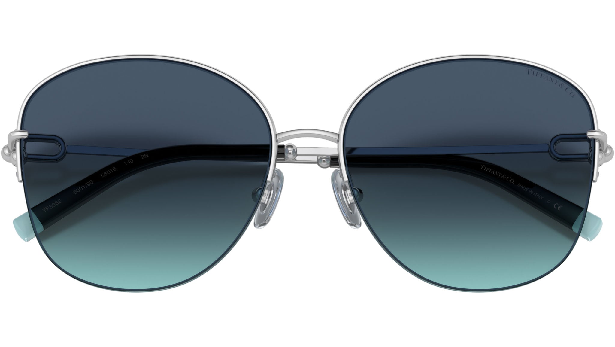Occhiali da sole Tiffany donna modello 3082 semi rim in metallo argento con lenti blu azzurro sfumato base 4. Naselli regolabili. Linea: Motifs. Codice brand: 0TF3082. Codice colore: 60019S. Rivenditore autorizzato online Tiffany Eyewear. Ogni prodotto Tiffany viene consegnato con astuccio originale e accessori ed è coperto da garanzia del produttore di 12 mesi.